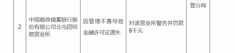 12月19日,阿勒泰金融监管分局行政处罚信息公示列表显示,中国邮政储蓄银行股份有限公司北屯团结路营业所,因管理不善导致金融许可证遗失,被警告并罚款8千元。