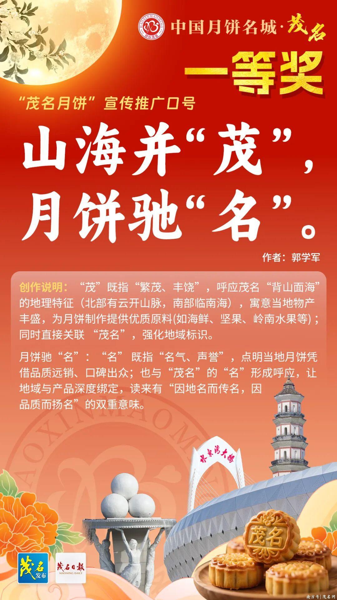 在给茂名月饼构思、创作宣传语时,就想用最凝练的文字,描绘出茂名和茂名月饼最鲜明的特色。所以“山海并茂” 就是这片土地最动人的底色 —— 连绵的青山蕴藏着自然的馈赠,辽阔的山海承载着地域的灵秀,这是茂名引以为荣的生态名片;而 “月饼驰名” 则是茂名土地最浓郁的鲜甜香的味道,小小一枚月饼包裹着传统的技艺、匠心的坚守,更承载着无数人对团圆的期盼与记忆。意境诠释既能看到这里的山水之美,也能感受到这里的人文之韵,让地域特色与传统美食在文字里相遇、相融。
