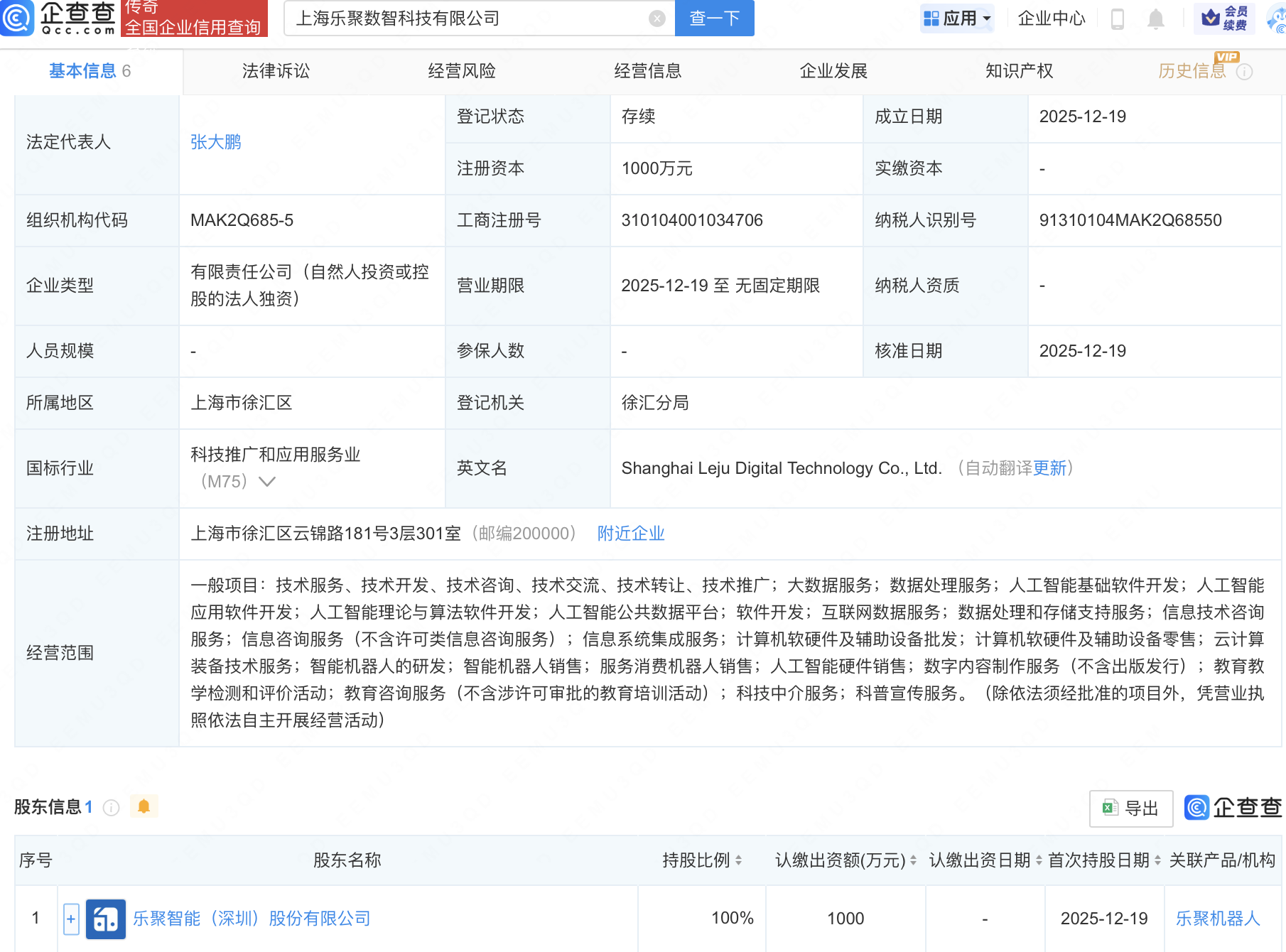 近日,上海乐聚数智科技有限公司成立,注册资本1000万元,经营范围包含:人工智能基础软件开发;人工智能应用软件开发;人工智能理论与算法软件开发;人工智能公共数据平台等。企查查股权穿透显示,该公司由乐聚机器人关联公司乐聚智能(深圳)股份有限公司全资持股。