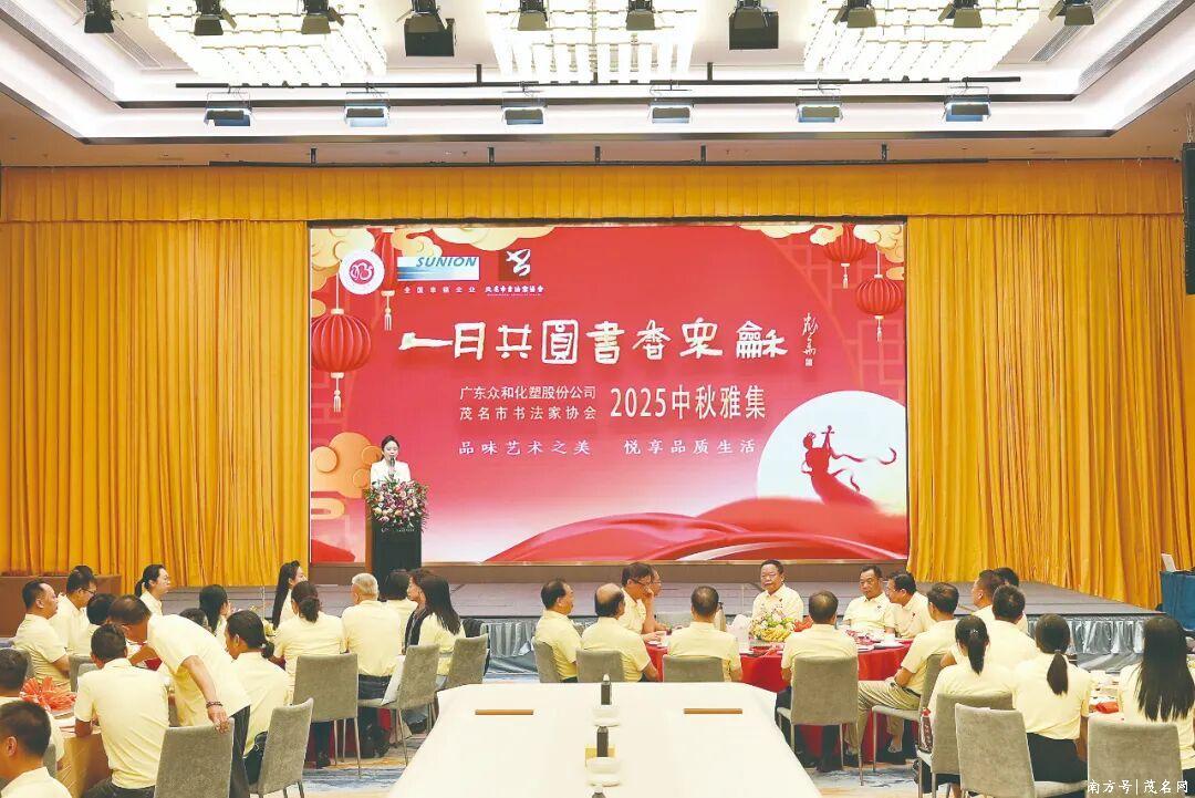 10月5日晚,由广东众和化塑股份公司与茂名市书法家协会联合主办的“人月共圆书香众和”2025中秋雅集活动在众和公司温情上演。市人大常委会副主任杨雄,市政协原副主席罗明等领导嘉宾与茂名市书法界名家、众和员工们欢聚一堂,共贺中秋佳节。