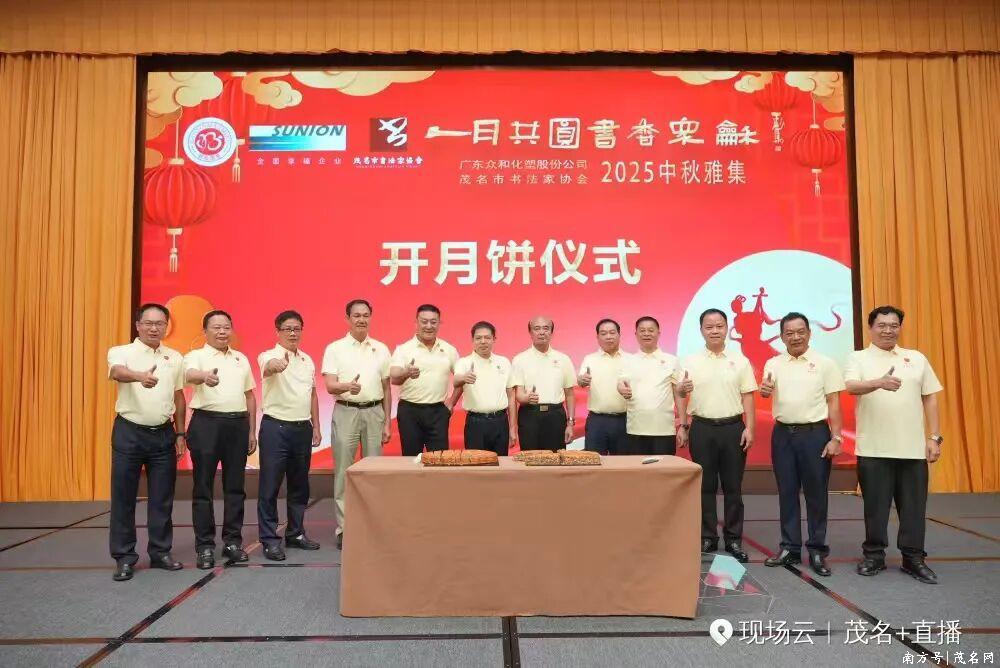活动在温馨的切月饼仪式中拉开帷幕。杨雄,罗明,茂名市书法家协会主席吴学翔,广东众和化塑股份公司党委书记、董事长黎广贞等领导嘉宾共同切开象征团圆的大月饼,将中秋的祝福传递给在场的每一位参与者。